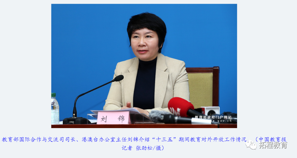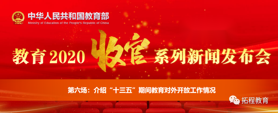 “十三五”期间对外开放工作情况 时间: 2020年12月22日 10:00 地点: 教育部北楼二层报告厅 主持人: 教育部新闻发言人续梅 内容: 介绍“十三五”期间教育对外开放工作情况 教育部国际合作与交流司司长 港澳台办公室主任刘锦 以习近平同志为核心的党中央高度重视教育对外开放。“十三五”期间,习近平总书记在一系列重大场合多次对外宣示要扩大教育对外开放。 2016至2019年,我国出国留学人数251.8万人,回国201.3万人,学成回国占比近八成(79.9%)。与此同时,通过引进国外高水平教育资源,进一步丰富国内高等教育资源供给。围绕“双元制”模式深入开展中德职业教育合作,推动完善现代职业技能人才培养体系。 应深入学习贯彻党的十九届五中全会精神,谋划好“十四五”时期教育国际合作与交流,以高水平对外开放建设高质量教育。 中国教育国际交流协会秘书处秘书长 王永利 对标国家职业教育改革实施方案,助力中国特色高水平高等职业学校和专业建设计划。实施国家“工匠之师”创新团队境外培训计划,引领高职院校境外办学活动。 我们在已有的来华留学质量认证、中外合作办学评估、标准建设的基础上,继续研发和实施更多的教育国际合作项目质量保障服务,推进认证、评估管理体系建设,引导自费留学中介机构健康发展,提升我国教育国际合作能力和水平,为我国建设高质量教育体系作出新贡献。 新闻来源于:中华人民共和国教育部网 ★ 识别二维码,关注我们 ★ 长按二维码 关注我们 了解更多双元制教育信息 电话:0838-2360789 13547041622 15883886201 18980111988 四川拓程教育咨询有限责任公司